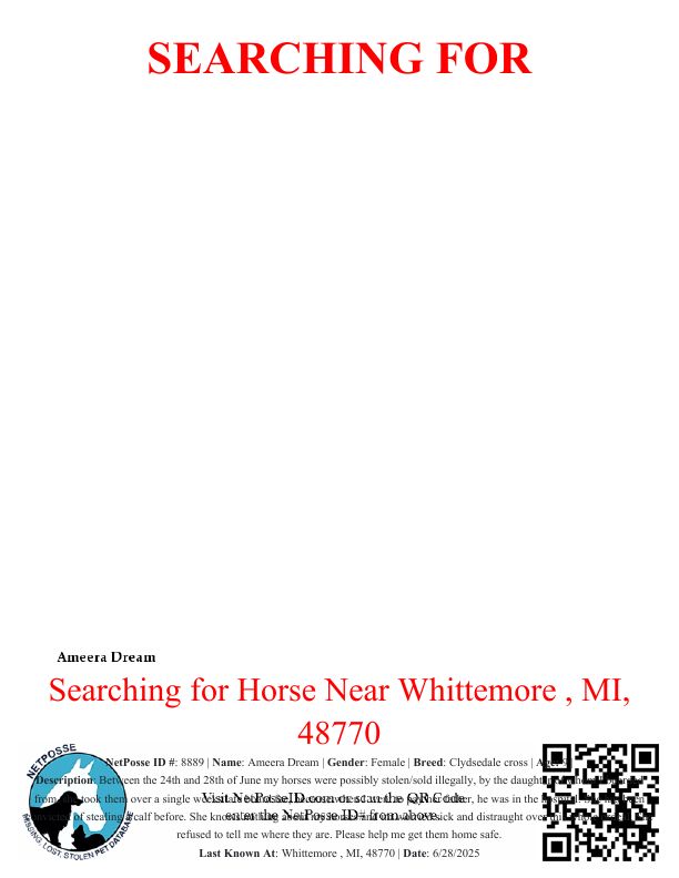 Description: Between the 24th and 28th of June my horses were possibly stolen/sold illegally, by the daughter of whom I boarded from, she took them over a single weeks late board fee, because when I went to pay her father, he was in the hospital. She has been convicted of stealing a calf before. She knows nothing about my horses and im worried sick and distraught over this whole ordeal. She refused to tell me where they are. She wanted to lease my mare previous to this happening and I told her No. Please help me get them home safe.