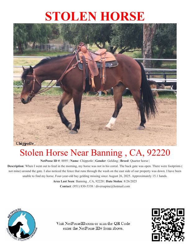 Description: When I went out to feed in the morning, my horse was not in his corral. The back gate was open. There were footprints ( not mine) around the gate. I also noticed the fence that runs through the wash on the east side of our property was down. I have been unable to find my horse.