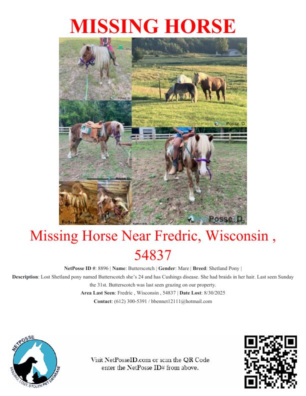 Description: Lost Shetland pony named Butterscotch she’s 24 and has Cushings disease. She had braids in her hair. Last seen Sunday the 31st. Butterscotch was last seen grazing on our property.