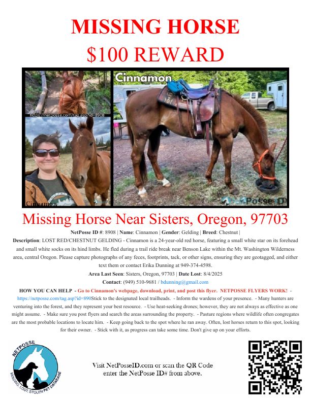 He fled during a trail ride break near Benson Lake within the Mt. Washington Wilderness area, central Oregon. At the time, he was fully equipped with a saddle and an orange halter.