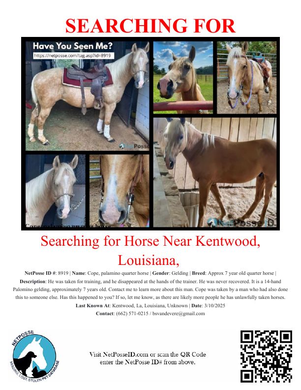 Please disseminate this message within the equine community and tag as many individuals as possible. Last September, I entrusted a trainer named Chris with the task of training my young horse, a rescue I rehabilitated at considerable veterinary expense and surgery. I duly paid for his training services. When I requested the return of my horse in November, he requested an additional month to continue the training. Subsequently, he continued to provide excuses, ultimately informing me that he had taken my horse to a ranch in Texas to work with a roper�"an action that was never authorized, as my intention was solely for basic training, not roping. He claimed that my horse was exceptional and could be sold for $50,000, which is implausible given that my horse lacks papers, titles, or earnings. I even accused him of selling my horse; he dismissed this allegation, which made me feel as though I was unjustified in my concerns. By March, it became increasingly difficult to contact him, and by April, I had lost all communication. I remain unaware of my horse's current whereabouts. At that time, he was located in Kentwood, Louisiana. Yesterday, I confirmed my concerns after speaking with another woman experiencing similar issues and learning of multiple others he has deceived. I am currently collaborating with livestock authorities and filing reports through various channels. My objective is to inform the public and to make clear that I seek the return of my horse. Please share this message broadly. If anyone can assist in locating him, I would be profoundly grateful�"even though I recognize it may be unlikely. I am praying for answers. Attached are his information, Venmo receipts, videos of alleged 'training,' and photographs of Cope, including images taken both in my possession and at his barn�" which later was discovered to belong to someone else.