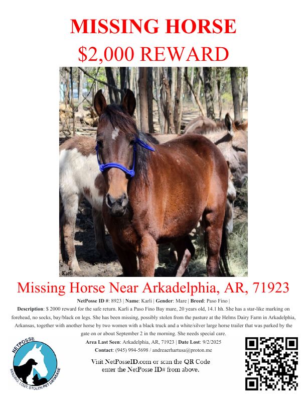 She has been missing, possibly stolen from the pasture at the Helms Dairy Farm in Arkadelphia, Arkansas, together with another horse by two women with a black truck and a white/silver large horse trailer that was parked by the gate on or about September 2 in the morning.