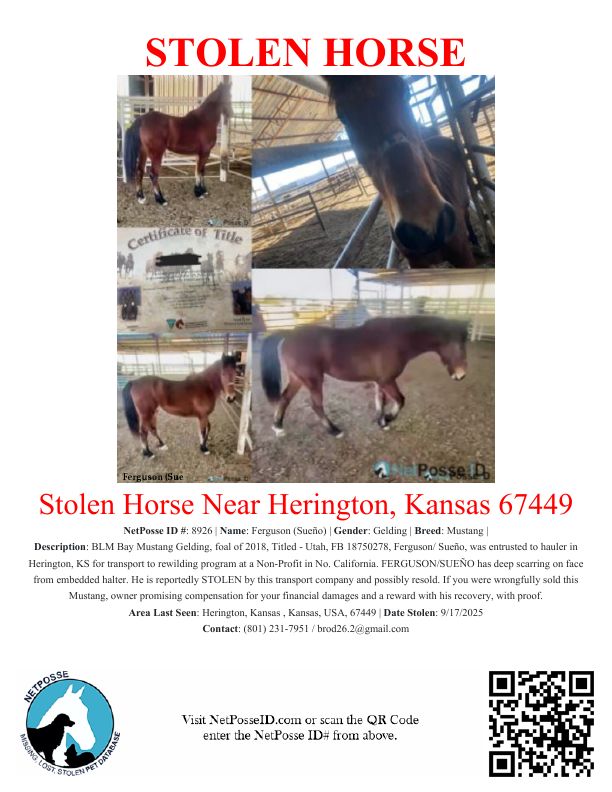 Description: Mustang Gelding was boarded, vetted, and transported by ranch in Herington, KS. for owner B Rodriguez. Gelding was to have arrived at Wild Horse Fire Brigade non-profit in Northern Ca. This never happened. Owner threatened legal action. Owner sent own transport to ranch, where Ferguson/Sueño was not found in September of 2025. Hauling company could not account for this geldings whereabouts. Also, horse's title entrusted to hauler by owner to have been delivered with Mustang to WHFB, missing from the file. There is an open ongoing criminal investigation regarding hauler with Kansas Attorney General’s office.