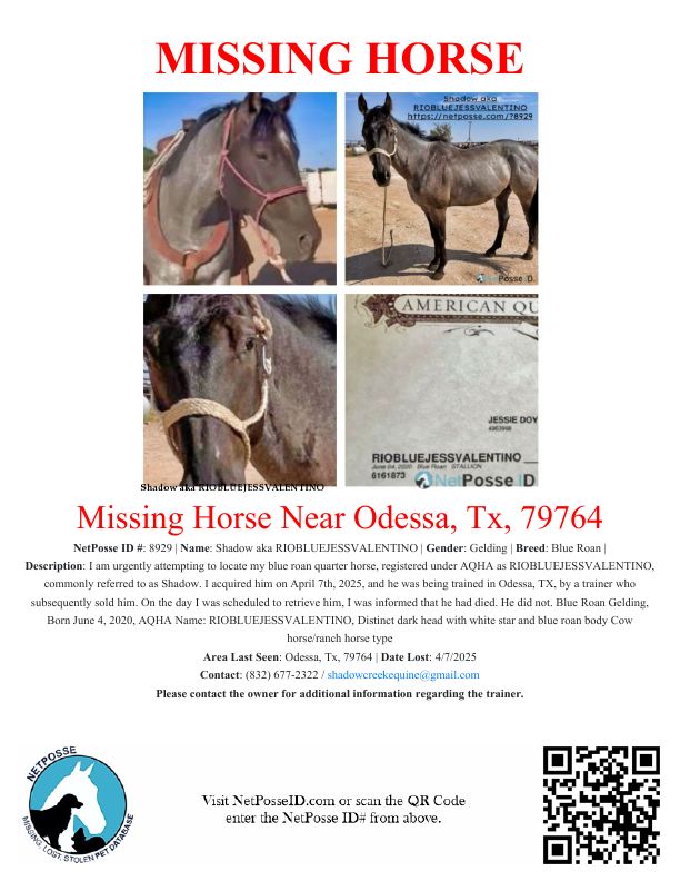 I am urgently seeking to recover my blue roan mare horse, Shadow, registered with AQHA as RIOBLUEJESSVALENTINO. I acquired him on April 7th, 2025, and he was placed in training in Odessa, TX, with a professional trainer. (Inquire with the owner for the trainer's name.)