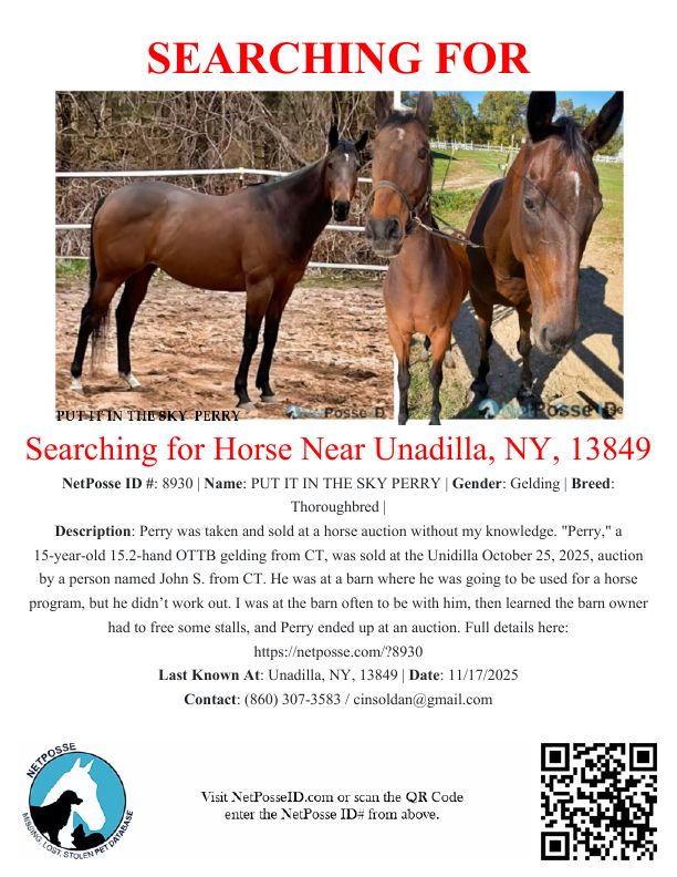 "Perry," a 15-year-old, 15.2-hand OTTB gelding from Connecticut, was sold at the Unadilla October 25, 2025 auction by a private individual named John also from Connecticut. I was unaware of this transaction and would never have consented to such a sale. His registered name is "PUT IT IN THE SKY," and his documentation was transferred with him to the auction.