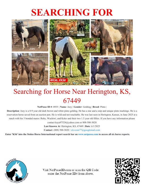 Description: Joey is a 8-9 year old dark brown and white pinto gelding. He is not a BLM mustang but likely is a reservation horse. He is wild and not touchable. He was last seen in Herington, Kansas, in June 2025 at a ranch with his 3 bonded mares: Ruby, Wachiwi, and Koko. Two of the mares had 1.5 year old fillies at their sides.