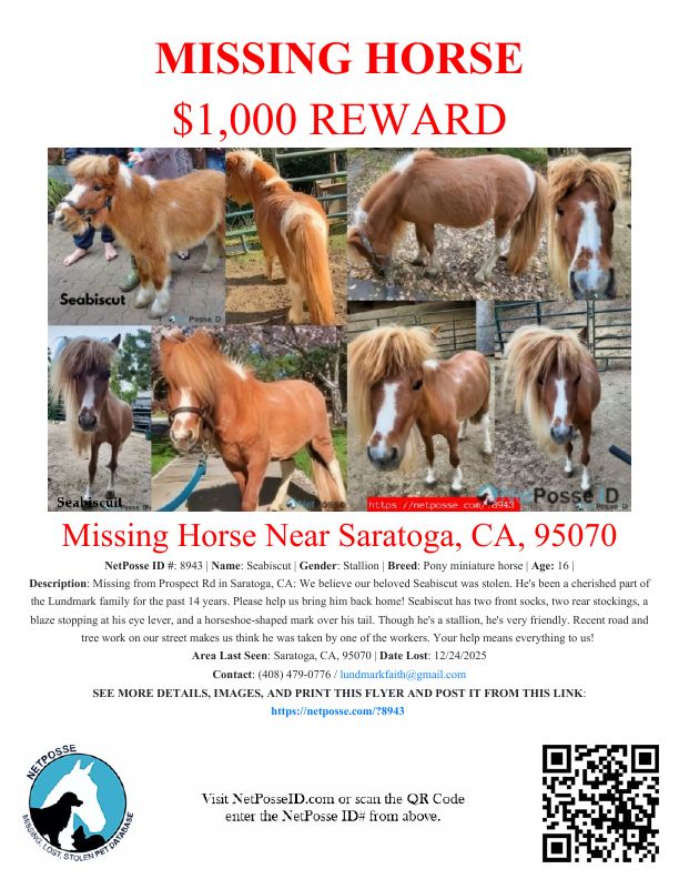 Description: 1,000 REWARD - Seabiscuit, missing from Prospect Rd in Saratoga, CA, is where we believe our beloved Seabiscuit was stolen. He's been a cherished part of the Lundmark family for the past 14 years. Please help us bring him back home! Seabiscut has two front socks, two rear stockings, a blaze stopping at his eye lever, and a horseshoe-shaped mark over his tail. Though he's a stallion, he's very friendly. Recent road and tree work on our street makes us think he was taken by one of the workers. Your help means everything to us! Faith Lundmark pays the reward.