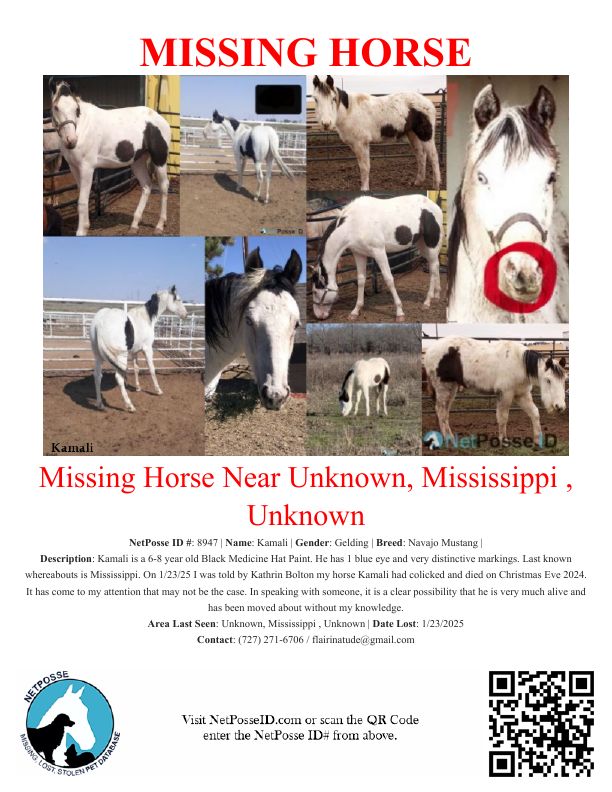 Description: On 1/23/25 I was told by Kathrin Bolton my horse Kamali had colicked and died on Christmas Eve 2024. It has come to my attention that may not be the case. In speaking with someone, it is a clear possibility that he is very much alive and has been moved about without my knowledge.