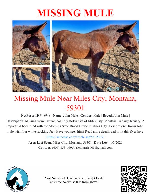 Description: Missing from pasture�"possibly stolen�"east of Miles City, Montana, in early January. A report has been filed with the Montana State Brand Office in Miles City.