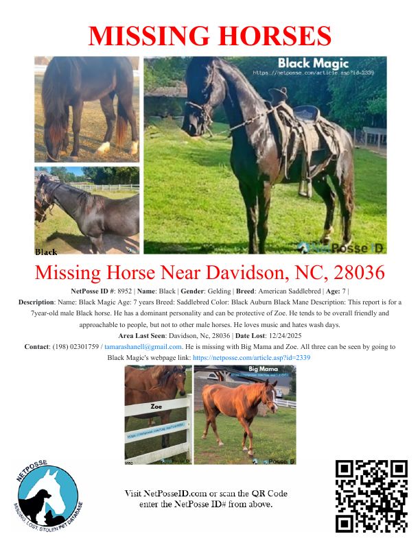 Original Description: Wednesday morning, we received a text from my neighbor that Black and Zoe were loaded on a trailer and hauled off the property. We immediately notified the listing agents and lawyers involved and reported it to the police. We just called for a wellness check-in with the Iredell Sheriff's Department, and an officer said he only saw 2 horses, not 3, at the present time. We were informed that the other horse, Big Mama, was probably sold. Big Mama and her baby Zoe are pictured here as well.