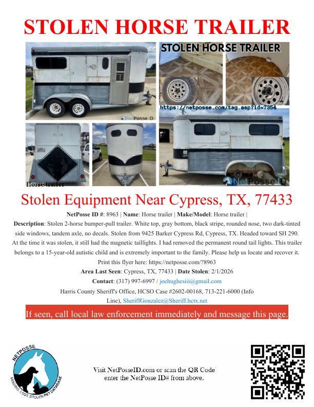 Description: STOLEN HORSE TRAILER -Scroll down to the COMMENT SECTION ON THIS PAGE to see a list of places to share, and updates.