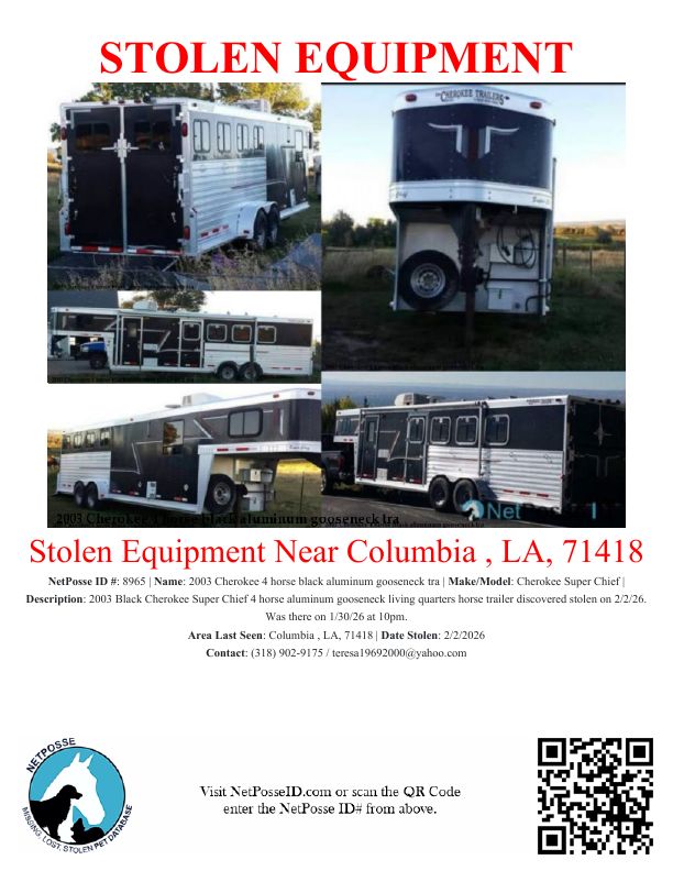 Description: On 2/2/26, this black Cherokee aluminum 4 horse gooseneck horse trailer was discovered missing from Hwy 846 in Columbia, LA from a private residence in Caldwell Parish. It was there on Friday 1/30/26 at 10pm. No one had permission to use or move trailer. Stolen report filed with Caldwell Parish Sheriff's Office in Columbia, Louisiana.