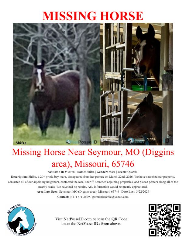 Description: Shifra, a 20+ yr old bay mare, dissapeared from her pasture on March 22nd, 2026. We have searched our property, spoke with all of our bordering neighbors, contacted the local sheriff, searched adjoining properties and have had no results.