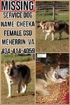 Description : Cheeka was running on my property which runs with the church cemetary with our other dog. The other dog came back but not Cheeka. I went to the church and saw a white SUV with 3 occupants 2 male 1 female. I asked if they saw a GSD they said no so I went down the dirt road. Due to rain and fog I had to turn back when I passed the church I saw occupants putting "something" in the back of the SUV. I tried to stop but when I applied the brakes I went into a ditch when I got out of the ditch the SUV sped down Meherrin Rd towards Rt 15 and I lost sight of the vehicle